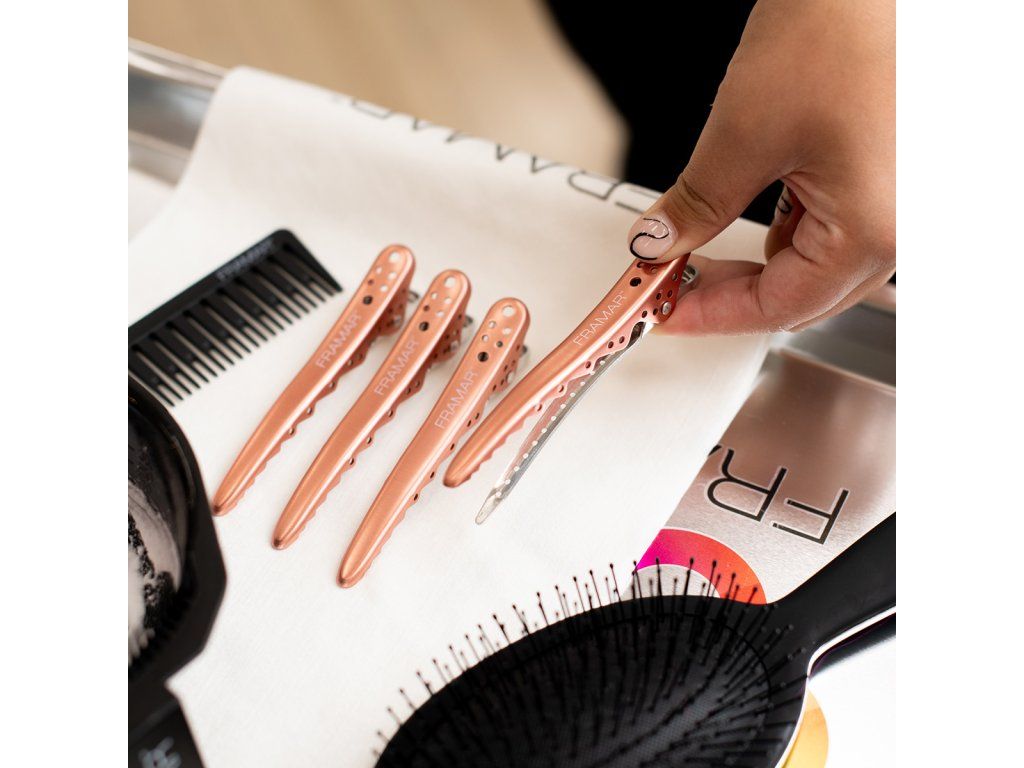 Precizní pevné klipsy Framar v metalické růžovo-zlaté barvě přinášejí absolutní kontrolu nad uchopením vlasů a sekcí během barvení, střihu i foukané. Díky celokovové konstrukci a pevné pružině drží i husté prameny bez sklouznutí.