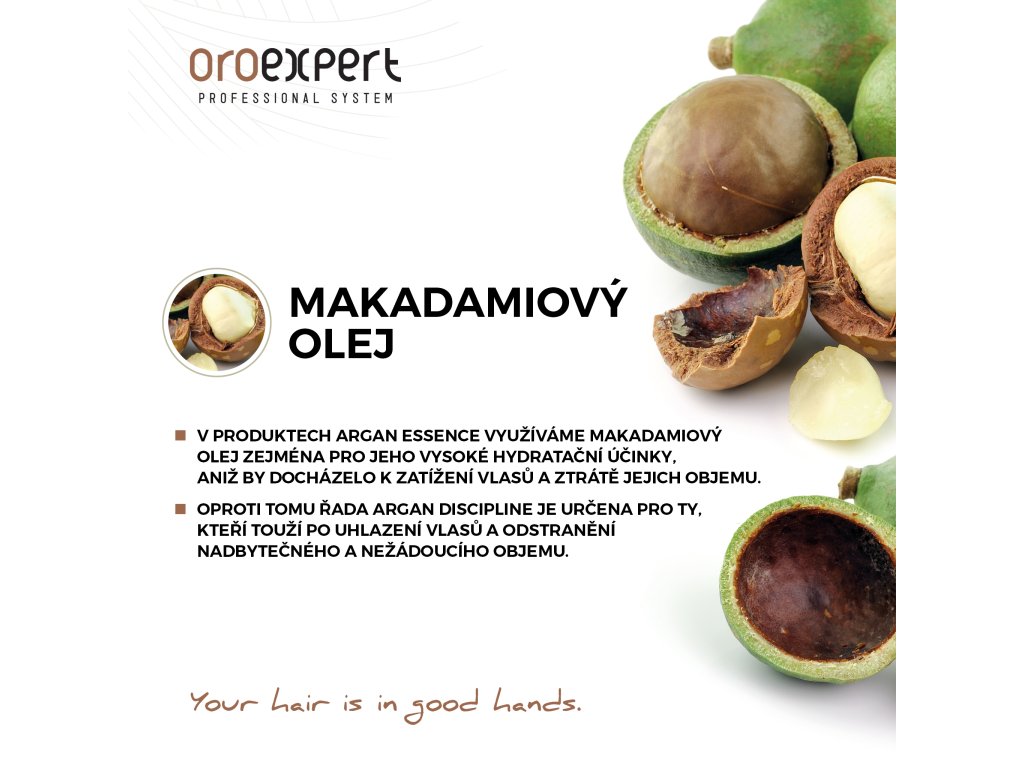 - V produktech Argan Essence využíváme makadamový olej zejména pro jeho vysoké hydratační účinky, aniž by docházelo k zatížení vlasů a ztrátě jejich objemu, což je u produktů péče na suché vlasy výjimečná vlastnost